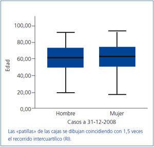 La edad media de los pacientes que inician TSR fue de 67,4 años (± 14,3). La mediana fue de 71,7 años (el recorrido intercuartílico, RI = 20,1). Al estudiar la mediana de edad por sexos se observó que el año 2008, las mujeres iniciaron tratamiento con una edad similar (67,9 años; RI = 19,3) a la de los hombres (67,2 años; RI = 19,6). Lo mismo sucede con las edades de los pacientes prevalentes según sexo (figura 2).