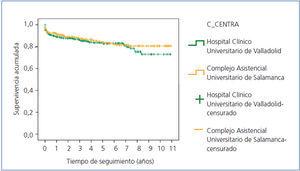 Del total de injertos, 820 se llevaron a cabo en Castilla y León y un 84,8% siguieron funcionando a 31 de diciembre de 2008. Se comparó la supervivencia de los injertos realizados en el Complejo Asistencial Universitario de Salamanca y en el Hospital Clínico Universitario de Valladolid (figura 3). Aunque a partir del séptimo año parece que hay divergencia entre las curvas de supervivencia, estas diferencias no son estadísticamente significativas.