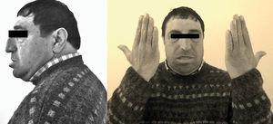 Significant exam findings included blood pressure: 163/111mmHg, Weight: 105kg, Height: 190cm, Body mass index: 29kg/m2. Slight cognitive deficit. Corpulent body phenotype. Facies with prognathism and macroglossia, thick lips, prominent brow ridges (Figure 1), deep voice. Normal on auscultation. Normal fundoscopy. The patient reported no changes in body morphology.