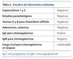 Se realizaron paraclínicos, entre ellos perfil infeccioso completo, que descartaron colitis de origen infecciosa (tabla 2). El hemograma reportó un valor de eosinófilos del 3,9% (valor absoluto, 269) y los niveles de tacrolimus fueron de 4,9 ng/ml. El paciente fue evaluado por gastropediatría, que planteó posible cuadro de colitis por medicamento. Se realizó colonoscopia con biopsia, que mostró hallazgos compatibles con colitis eosinofílica sin hallazgos compatibles de lesiones colónicas por micofenolato (fig. 1). En valoración conjunta por nefrología y gastroenterología pediátrica se consideró el diagnóstico de colitis eosinofílica por tacrolimus, y se ordenó cambio a ciclosporina, con lo que presentó mejoría clínica y resolución de la diarrea.