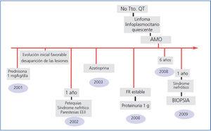 Figura 3. Esquema del curso clínico (seguimiento a 10 años) desde el comienzo en forma de vasculitis cutánea por crioglobulinas hasta el diagnóstico y tratamiento del linfoma linfoplasmocitario.