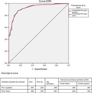 La comparación entre la probabilidad de presentar ND calculada por la función logística y por el sistema de puntos (score) mostró una alta concordancia (índice kappa de 0,944, p<0,0001). Por otra parte, las curvas ROC de dichas probabilidades mostraron un área bajo la curva de 0,92 en ambos casos, lo que indica que se ajusta bien (fig. 2).
