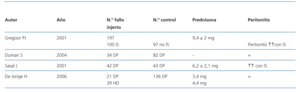 - Duman S et al. no encuentran diferencias en la tasa de peritonitis en los dos grupos en DP con o sin fallo del injerto. Sólo 4 de 34 pacientes con injerto llevaban prednisona8.