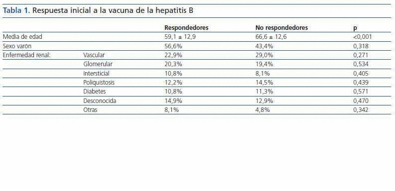 Setenta y cuatro pacientes (54,4%) desarrollaron inmunidad después de la vacunación contra la HB. De éstos, 39 pacientes (52,7%) presentaron un título de anticuerpos >100 UI/ml, nivel que se ha considerado como el umbral necesario para mantener una adecuada seroprotección en pacientes en HD. La respuesta a la vacuna de la HB estuvo relacionada con la edad, siendo la edad media de los pacientes no respondedores superior a la de los respondedores. Por el contrario, el sexo y la etiología de la enfermedad renal crónica no influyeron en la respuesta (tabla 1).
