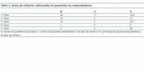 Los 62 pacientes que no respondieron a las tres dosis de vacunación inicial fueron sometidos a dosis de refuerzo adicionales, aunque sólo 46 pacientes pudieron ser evaluados al final del primer año, ya que el resto de pacientes fallecieron, fueron trasplantados o trasladados a otra unidad. La eficacia global de estas dosis fue del 21,6%: con la primera dosis, un 23,9% de los pacientes seroconvirtió; con la segunda dosis, un 12%; y con la tercera, un 37,7% (tabla 2). Un 42,8% de los pacientes que seroconvirtió presentó un nivel de anticuerpos anti-Hbs >100 UI/ml. El porcentaje de pacientes que mantuvo niveles de anticuerpos protectores tras la primera dosis de refuerzo fue del 69,2% en el primer control anual posterior.