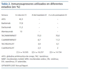 Las pautas de inmunosupresión referidas al año 2006, recogidas en el registro norteamericano OPTN/SRTR 2007 Annual Report (http://www.ustransplant.org), se muestran en la tabla 2.