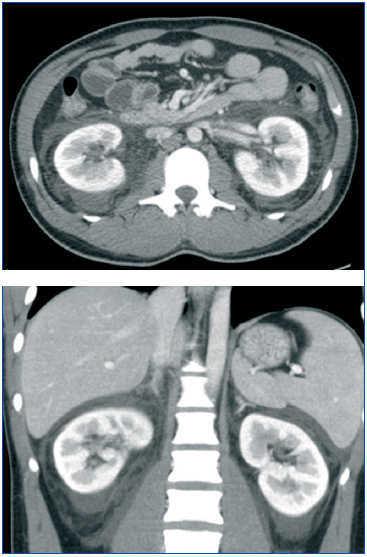 La radiografía de tórax y abdomen fueron normales. En la ecografía abdominal y tomografía axial computarizada abdómino-pélvica se objetivaban riñones morfológicamente normales sin dilatación de vía excretora con líquido libre perirenal y en pelvis (figura 1).