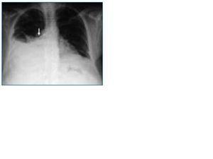 A los 29 días, la paciente acude a hemodiálisis refiriendo disnea y dolor escapular derecho. Al iniciar la sesión, se extrajo líquido claro por la rama arterial y hemático por la venosa. La radiografía de tórax urgente (fig. 1) mostró derrame pleural derecho. Se extrajeron 700 cc de líquido claro a través de la rama arterial (seroma) y se retiró el catéter. La paciente fue dializada sin heparina a través de un catéter femoral derecho. A los 15 minutos de finalizar la hemodiálisis la paciente inició un cuadro súbito de dolor costal derecho, disnea, sufriendo una parada cardiorrespiratoria. La exploración física reveló hipoventilación pulmonar derecha. La analítica mostró descenso de la hemoglobina y la radiografía de tórax opacidad pulmonar derecha completa. Con la sospecha de hemotórax masivo se colocó un tubo de tórax y se iniciaron maniobras de resucitación. La paciente fue trasladada a la UVI donde permaneció 72 horas, pasando posteriormente a nuestra Unidad de Hospitalización sin secuelas.