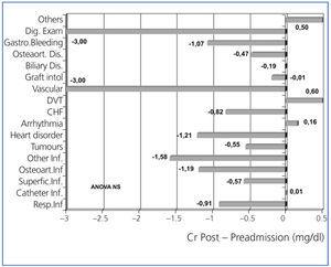 Figure 4. Variation of the serum creatinine (Cr) levels after hospital admission compared with levels before admission, considering the disorder that caused the admission
