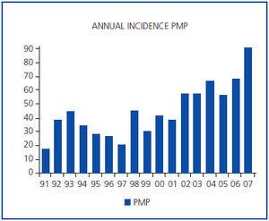 During this time the total number of patients seen for any reason in the department was 5,071. 479 of these were diagnosed with hypertensive nephropathy, in accordance with the criteria described in the previous section. The mean incidence of nephroangiosclerosis throughout the entire period under consideration was 44.0 pmp and the mean age was 66.6 ± 12.1 years. 43.0% of the patients were female and 57.0% were male. In 60 cases the diagnosis of hypertensive nephropathy was confirmed by renal biopsy. A progressive tendency was observed, rising from 16.7 pmp in 1991 to 89.5 pmp in 2007. The mean rates were 31.8 pmp during the period 1991-1995, 32.1 pmp from 1996 to 2000 and 54.4 during the period from 2001-2006 (figure 1).