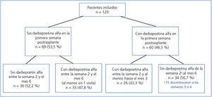 De los 162 pacientes adultos trasplantados en los centros participantes entre abril y diciembre de 2004, 129 cumplieron los criterios de selección y fueron incluidos en el estudio (33 casos fueron excluidos, 2 por falta de seguimiento de Hb y 31 por niveles bajos de ferritina o Tasa o porcentaje de saturacion de la transferrina [TSAT]). No se observaron diferencias significativas entre los pacientes incluidos y excluidos (datos no mostrados). Se administró darbepoetina alfa (por vía subcutánea) a 60 individuos (46,5 %) durante la primera semana postrasplante. De ellos, 19 pacientes solo recibieron el fármaco durante la primera semana, 15 durante un mes, 7 durante 3 meses y 19 durante todo el período de 6 meses del estudio. Treinta y tres pacientes no tratados durante la primera semana recibieron darbepoetina alfa en algún momento entre la semana 2 y los 6 meses (de los cuales 12 la iniciaron entre los meses 1-2 y continuaron tratados hasta el mes 6). La figura 1 muestra la distribución de la población de estudio según la administración de darbepoetina alfa.