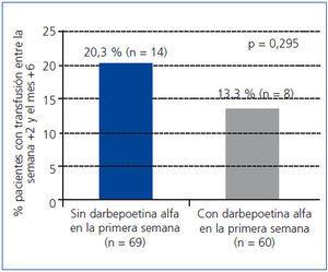 Figura 4. Porcentaje de pacientes con transfusión entre la semana +2 y el mes +6 según el uso de darbepoetina alfa en la primera semana