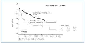 El fracaso progresivo de las funciones depurativas renales, así como de producción de hormonas y otras funciones metabólicasrenales, determina la aparición de alteraciones en la concentración de electrolitos y del equilibrio ácido-base, del calcio y del fósforo, acumulación de productos nitrogenados y aparición de anemia. Además, este grupo de pacientes presenta una serie de características especiales principalmente matizadas por la exposición al tratamiento inmunosupresor, lo cual diferencia a estos pacientes de los incidentes por primera a diálisis, confiriéndoles unas características propias. Este grupo de pacientes, cada vez más numeroso, que vuelven a diálisis tras el fallo del injerto, representa un grupo de alto riesgo, porque tienen mayor morbilidad y mortalidad en los primeros meses, de causa infecciosa y cardiovascular13. Esta tasa de mortalidad elevada es demoledora cuando se compara con la mortalidad durante el trasplante en series publicadas en diversos países. Analizados 73.707 trasplantes renales realizados entre 1988 y 1997 y 4.703 exitus tras la pérdida del injerto, se observa que la supervivencia del paciente después de la pérdida del injerto es del 76, 60 y 48% al año, tres años y cinco años, respectivamente. El tiempo previo de estancia en diálisis antes del trasplante es un factor de riesgo de muerte, pero no así el tiempo funcionante del injerto14,15. El aumento de la mortalidad es atribuido a causas cardiovasculares e infecciosas. La alta tasa de mortalidad cardiovascular puede deberse a factores de riesgo clásicos favorecidos por la inmunosupresión, el efecto de la uremia y el estado inflamatorio producido por el injerto rechazado16,17. Djamali et al., al comparar la evolución de 1.762 pacientes con enfermedad renal crónica con 890 pacientes trasplantados renales y tras 16 años de seguimiento, objetivaron una menor progresión de la enfermedad renal en los pacientes trasplantados que, sin embargo, no se traducía en una menor mortalidad. Es decir, esta población presenta unas características comórbidas propias que anulan el potencial efecto beneficioso de la lenta progresión de insuficiencia renal18. De hecho, Arias et al., al comparar pacientes que iniciaban diálisis por primera vez con aquellos que volvían a diálisis tras la pérdida de un injerto renal, observaron que el grupo de pacientes que volvía a diálisis lo hacía con filtrado glomerular, cifras de hemoglobina y albúmina más bajas que aquellos que iniciaban diálisis por primera vez, conllevando también un mayor número de hospitalizaciones19. Para ilustrar este hecho, en la figura 1 se exponen datos del Hospital Marqués de Valdecilla que muestran la supervivencia del paciente tras el inicio de diálisis comparando ambos grupos. La mortalidad de los pacientes que vuelven a diálisis es claramente superior que la de los pacientes que inician diálisis por primera vez, siendo la supervivencia al año y los cinco años del 80 y 62% vs. 93 y 78%, respectivamente. El riesgo relativo de mortalidad fue de 2,05, (IC 95%, 1,26-3,35)20.