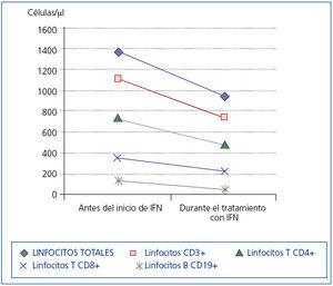 Adicionalmente se realizó un recuento de poblaciones linfocitarias antes y durante la terapia con IFN-α, evidenciándose una importante linfopenia, con disminución tanto de linfocitos T (CD4+ y CD8+) como de linfocitos B, durante el tratamiento (figura 1).