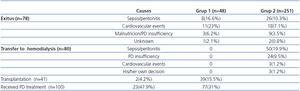 The most common causes of death were cardiovascular diseases (47.8%) and peritonitis and/or sepsis (34.7%) in group 1 and peritonitis and/or sepsis (47.2%) and cardiovascular diseases (32.7%) in group 2.