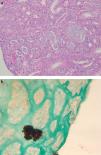 In four patients a biopsy was performed. The renal biopsy findings in PN primary involve the tubules and were dependent on the time interval between the preparation with oral sodium phosphate and renal biopsy. The biopsy from patients with AKI acute degenerative changes predominated a resemble findings seen an acute tubular necrosis.11 The renal biopsies performed in patients with chronic course showed tubular atrophy and interstitial fibrosis. Regardless of the degree of acuity of chronicity, the hallmark of PN was abundant tubular and less prominent interstitial calcium phosphate deposits (Fig. 1). The calcifications do not polarize and have a strong histochemical reaction with the von Kossa stain, indicating that they are composed of calcium phosphate.