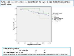 Después de un seguimiento medio de 168,9 [3-24] meses, 77 seguían activos, 24 habían fallecido y 36 se habían trasplantado o se habían trasladado. Los pacientes con un Mg superior a 2,1mg/dl tienen una supervivencia mayor que los de menor Mg (fig. 2). La supervivencia de los pacientes con los tres tipos de LD no difería significativamente, Log-Rank, p=0,424 (fig. 3). Si corregimos por la magnesemia el efecto del tipo de LD sobre la mortalidad, los pacientes con citrato, LD tipo 2, tienen mejor supervivencia que los que se dializan con acetato (fig. 4).