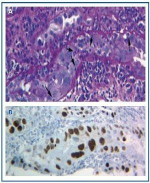 Figura 1. Inclusiones virales nucleares basofílicas en las células epiteliales y tubulitis en la nefropatía por poliomavirus BK (A) e inmunohistoquímica para el antígeno SV-40 AgLT (B).