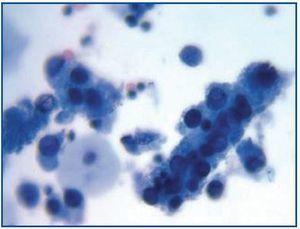 El curso clínico típico de la NAPBK9 representado en la figura 3, muestra cómo el desarrollo de la enfermedad se encuentra precedido por la aparición de viruria BK (Vr BK), reflejo de la reactivación viral y de la replicación en el tracto urinario, con la aparición de las típicas células decoy (células señuelo)(figura 4), fáciles de identificar mediante estudios rutinarios de citología de orina, aunque la cuantificación de la Vr mediante técnica de PCR es más sensible que la citología y permite distinguir entre infección por VBK y VJC.
