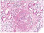 • Microscopia óptica: 11 glomérulos, 2 globalmente esclerosados, otros 2 con retracción del ovillo capilar, con plegamiento de las asas capilares y fibrosis pericapsular. Los restantes mostraron una prominente expansión de la matriz mesangial y de las paredes capilares por un material amorfo PAS (ácido peryódico de Schiff) positivo. Plata metenamina, negativo. Intersticio con moderada fibrosis intersticial, atrofia tubular acompañada de un infiltrado inflamatorio mono-nuclear restringido a dichas áreas (fig. 1).