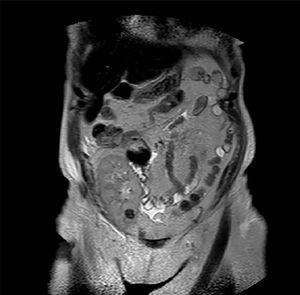 Caso 3. Mujer de 68 años afecta de nefropatía diabética, en hemodiálisis desde 2003. En enero de 2010 recibe injerto renal de donante cadáver, con posoperatorio sin complicaciones y funcionamiento inmediato del injerto. El riñón contralateral del mismo donante fue desestimado para trasplante en la extracción por presentar una biopsia con severa fibrosis intersticial y glomeruloesclerosis, y múltiples lesiones milimétricas corticales compatibles con adenomas tubulares, mientras que la biopsia y el aspecto macroscópico del injerto implantado fueron satisfactorios. En control rutinario a los 12 meses se detecta por ecografía un nódulo hiperecogénico en polo inferior del injerto de 12 mm de diámetro máximo, intrarrenal, no visualizado en exploraciones previas. Se confirma la existencia de dicha nodulación por RMN (figura 3) y se decide practicar una biopsia renal que confirma la presencia de células compatibles con carcinoma de células papilares tipo I. La función renal era estrictamente normal y la paciente decidió seguir controles ecográficos periódicos y no realizar ninguna actitud ablativa en primera instancia, debido a la óptima función renal y la difícil accesibilidad del tumor para tratamiento conservador. Se había iniciado tratamiento inmunosupresor con prednisona, ácido micofenólico y tacrolimus, y se procedió a cambio de la inmunosupresión, sustituyendo el tacrolimus por everolimus tras el diagnóstico del tumor renal. Tras 22 meses de seguimiento la paciente se encuentra asintomática, con una creatinina de 1,15 mg/dl y en los controles ecográficos posteriores no se ha evidenciado cambio del tamaño del tumor. Se estudió igualmente el receptor del hígado del mismo donante, que fue sometido a estudio de imagen sin hallar masas sospechosas en su injerto.