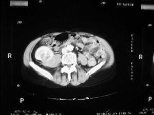 Caso 1. Varón de 56 años que inicia hemodiálisis en 1990 por nefropatía hipertensiva y en 1992 se le somete a un trasplante renal de donante cadáver que evolucionó sin complicaciones. En 2006, estando asintomático y por un deterioro de la función renal, se detecta por ecografía una masa en polo superior del injerto de 5 cm de diámetro máximo. Se procedió a una biopsia percutánea de la masa que confirmó la presencia de carcinoma de células renales. Se llevó a cabo un estudio de extensión con TAC (figura 1) y resonancia magnética nuclear (RMN), que no mostró extensión locorregional, y se procedió a transplantectomía extracapsular con linfadenectomía. El resultado en la anatomía patológica definitiva fue de carcinoma de células claras variante sarcomatoide de 5 cm infiltrando la cápsula del riñón y tejidos circundantes sin infiltración de vena ni de ganglios resecados (pT3aN0). Tras 6,5 años de seguimiento, el paciente está libre de enfermedad. En el estudio genético con micro-arrays de DNA se evidenció el origen tumoral de las células del propio paciente. Se descartó la presencia de neoplasia en los riñones nativos, y por tanto la hipótesis de metástasis procedente de estos.