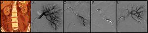 Mujer de 42 años con antecedentes de lupus, prótesis valvular aórtica en tratamiento con dicumarínicos e insuficiencia renal en estudio. Previo al abandono de la anticoagulación se realiza una biopsia renal. A las 6 h de la biopsia presenta un dolor intenso en el flanco izquierdo con anemización severa. Se realiza una angio-TAC donde se objetiva un hematoma retroperitoneal y un pseudoaneurisma (PSA) (flecha) (A). Mediante un acceso femoral derecho y la colocación de un introductor 6F se cateteriza la arteria renal izquierda con la ayuda de un catéter Cobra 5F y una guía (0.014”) con punta atraumática. Seguidamente, se realiza una arteriografía selectiva donde se objetiva el PSA (B y C). Y, por último, se avanza un microcatéter 2, 7 F (Progreat, Terumo®) a través del catéter Cobra hasta llegar a la lesión y se emboliza con microcoils de liberación controlada (Detach-18, Cook®) con un resultado óptimo (D y E).