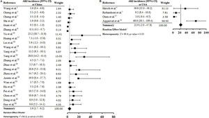 AKI occurrenceFrom 30 studies included in this systematic review, only two20,29 reported that patients did not develop AKI and were not included in the meta-analysis. Among the studies that registered the occurrence of AKI, all used the KDIGO criteria for the AKI diagnosis and, by the crude analysis of the data, we verified that the overall incidence of the event was between 0.3%9 and 69%,33 while in the ICU the overall AKI incidence was between 2.9%8 and 53.2%.4 The highest rate of need of RRT was 22.7%.31 The crude mortality of patients with COVID-19 and AKI reached 100% in four studies19,26,34,35 (Table 2).
