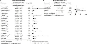 AKI estimate incidence in patients with secondary infection was 31.6% (CI 12.3–51.0%) and among those sepsis/shock was 4.7% (CI 2.1–7.4%) (S7 File). In the correlation tests, the incidence of these complications was also directly proportional to the AKI incidence (S9 File). Among selected studies, the rates of secondary infection and sepsis/shock were between 2.8%30 and 75%33 and between 0.3%9 and 65%,34 respectively. These complications result in hemodynamic instability, contributing to the increased need for RRT and the mortality rate among patients.37–40