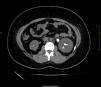 Non-contrast CT KUB which shows a swollen left kidney secondary to a stone with maximal size of 2.0cm in the left PUJ as well as multiple small stones in the right lower calyces of the kidney and left middle and lower calyces. This highlights the patient's significant stone burden despite being on optimal treatment for cystinuria.