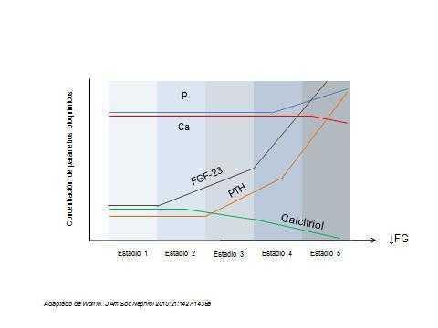 Isakova et al. realizaron un estudio con una cohorte de 3879 pacientes en diferentes estadios de ERC y observaron que, ya en estadios muy precoces de la enfermedad (FG 57,8 ml/min/1,73 m2, intervalo de confianza al 95 % 55,4-60,8), el FGF-23 aumentaba, antes incluso de que lo hicieran la PTH, el P o que descendieran los niveles de calcitriol. En el estrato de pacientes con FG entre 50-59 ml/min/1,73 m2, más de la mitad presentaban un aumento de niveles de FGF-23, a diferencia del 3 % de hiperfosfatemia o el 22 % de HPS13. Ello sugiere incluso el potencial uso de FGF-23 como marcador precoz de alteraciones del metabolismo óseo y mineral en la enfermedad renal crónica (CKD-MBD), incluso cuando todavía los niveles de P son normales pero ya puede haberse iniciado una retención corporal de P. A la espera de su introducción en el mercado, parámetros como la FEF podrían utilizarse en la práctica clínica para estimar la presencia de una sobrecarga de P, como recomiendan las guías de la S.E.N.14, antes de la presencia de hiperfosfatemia.