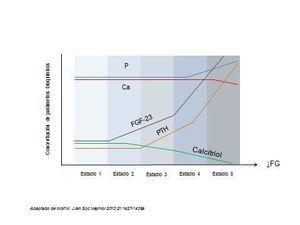 El FGF-23 podría ser también un nuevo marcador de progresión renal, como indican algunos estudios donde se ha visto que existe una correlación inversa entre sus niveles y el descenso de FG. Otros autores sugieren que la combinación de elevación de FGF-23 con disminución de los niveles de calcidiol proporciona la mejor estratificación del riesgo de progresión de la función renal. Sin embargo, en pacientes con ERC avanzada (FG < 30 ml/min/1,73 m2), la relación entre FGF-23 y ERC terminal se pierde al ajustar por FG, ya que este último es el principal determinante en la progresión de la ERC49. Se necesitarán futuros estudios para dilucidar si FGF-23 actúa como biomarcador de ERC o posee un mecanismo directo en la progresión de la enfermedad. Como se ha mencionado antes, también se ha descrito que Klotho podría tener un papel renoprotector, como sugieren algunos estudios experimentales, reduciendo la apoptosis en fracasos renales agudos de origen isquémico.