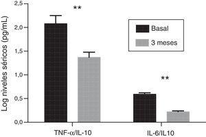 En las CMSP provenientes se analizó la evolución de los niveles de expresión génica de las citocinas proinflamatorias IL-6 y TNF-α. Tras 3 meses de administración de paricalcitol oral, los niveles de ARNm de estas citocinas mostraron un descenso significativo, con un valor porcentual medio de 14,13 y de 34,17%, respectivamente (p<0,001). Por su parte, el nivel de expresión de la IL-10 no mostró variaciones significativas. Tampoco se observó que hubiera correlación entre el cambio en los niveles de expresión de IL-6 y de TNF-α y las variaciones observadas en las concentraciones séricas de estas citocinas. Finalmente, los cocientes de los niveles de expresión del TNF-α y de la IL-6 con respecto a los de la IL-10 experimentaron una reducción significativa de un 45,6% y de un 13,4%, respectivamente, tras el tratamiento (p<0,01 y p<0,001, respectivamente) (fig. 2).