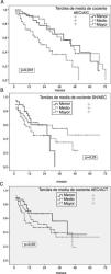 Risk of enteric germ peritonitisUnivariate analyses showed a significantly increased risk of enteric peritonitis in patients in the highest third of ECW/ICW ratio (p = 0.007) (Fig. 2 A), OH/ECW (Fig. 2B) and ECW/TBW (Fig. 2C). In the case of absolute OH, only one trend in the same direction was observed (p = 0.096). On the contrary, the highest third of LMI associated a tendency to lower risk of this complication (p = 0.092) (FMI NS). Patients who suffered some episode of enteric peritonitis had higher degrees of absolute OH (1.92 ± 1.83 versus 1.03 ± 1.73 l; p = 0.059), ECW/ICW ratio (1.02 ± 0.17 versus 0.92 ± 0.13; p = 0.012) OH/ECW ratio (0.12 ± 0.11 versus 0.05 ± 0.09; p = 0.016), and ECW/TBW ratio (0.51 ± 0.04 versus 0.46 ± 0.04; p = 0.010) at the start of PD than those who did not present this complication.