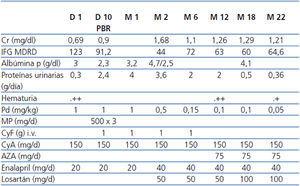 De acuerdo con las pautas nacionales (www.nefroprevencion.org.uy), se inicia tratamiento con bolos de metilprednisolona 1 g/d x 3 y ciclofosfamida 15 mg/k, mensual x 6, continuando con prednisona 1 mg/k. Se mantuvo ciclosporina 2 mg/k/d y se suspendió MMF. La evolución se muestra en la tabla 1.