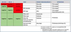 Otro grupo de pacientes que se pueden considerar complejos son los pacientes de alto riesgo inmunológico, sensibilizados. No es infrecuente que los TRDV con incompatibilidad HLA sean excluidos del análisis de supervivencia en los resultados de TRDV ya que las tasas de supervivencia no son tan buenas como los trasplantes sin anticuerpos y compatibles. Sin embargo, para algunos pacientes, el trasplante en dichas circunstancias representa la única opción para independizarse de la diálisis. Las recomendaciones es establecer programas específicos para seleccionar un donante para el que el receptor no produzca anticuerpos. En la donación de vivo, este objetivo puede lograrse mediante estrategias de intercambios de pareja. Se puede plantear trasplantar pacientes con DSA solo si estas medidas antes mencionadas no se pueden lograr y con programas de desensibilización. En sí mismo la presencia de DSA detectables por otras técnicas que no sean la técnica de citotoxicidad dependiente del complemento se considera como un factor de riesgo, pero no una contraindicación101. Frente a la incompatibilidad HLA, el uso de las técnicas de desensibilización en el TR ABOi ofrece resultados a largo plazo similares a los TR ABOc53.