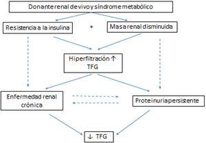 La realización de una nefrectomía en una persona sana no es inocua, si bien es cierto que el riesgo de mortalidad inmediata asociada a la donación renal de vivo se estima en un 0,03% y no ha variado en los últimos 15 años33. La incorporación de la nefrectomía laparoscópica ha supuesto una mejora considerable en el postoperatorio inmediato del donante, con un más rápido restablecimiento y reincorporación a la vida social y laboral. A largo plazo, la probabilidad de desarrollar una enfermedad renal avanzada por el donante renal de vivo, si bien es inferior a la descrita en la población general (que tiene comorbilidad), es superior a dicha probabilidad si el donante no se hubiera sometido a la nefrectomía34–37. La edad, la raza negra, la obesidad y las enfermedades familiares genéticas han demostrado ser factores de riesgo en la evolución de los donantes a largo plazo. Deben, por tanto, tenerse en cuenta en la valoración de riesgos de un donante, en la información que se facilita tanto a donante como a receptor y en el cuidado del donante tras el procedimiento9.