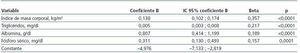 Mediante regresión lineal múltiple, las variables que entraron a formar parte de la mejor ecuación predictiva para los valores HOMA fueron: el índice de masa corporal, los triglicéridos, la albúmina plasmática y los niveles de fósforo sérico (tabla 2).