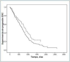 Figura 2. Curvas de supervivencia en pacientes con HOMA en el tercil inferior (línea discontinua) y el resto de los pacientes de estudio (línea continua). El modelo es una estimación tras ajuste con edad, sexo, índice masa corporal, albúmina, proteinuria, fósforo
