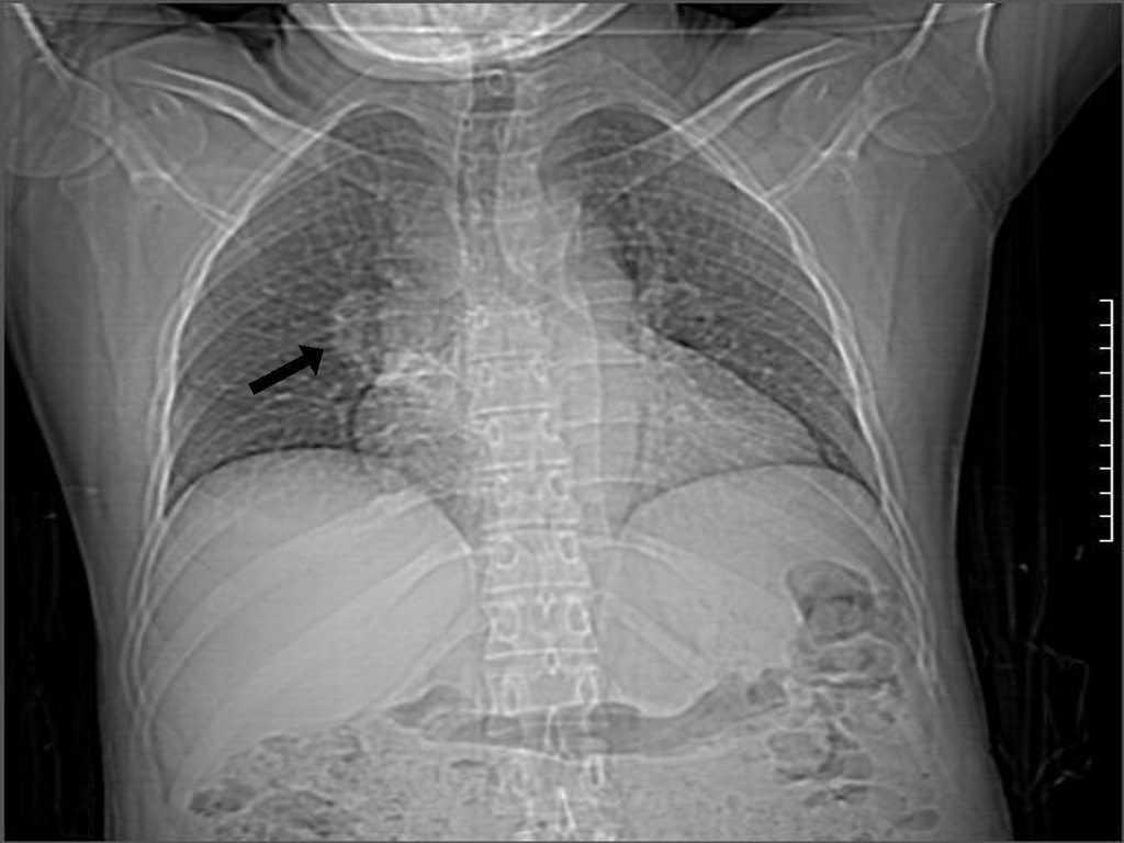 Figura 1. Imagen que muestra engrosamiento del hilio pulmonar derecho.