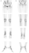Siete años después, el paciente desarrolló una anemia normocrómica normocítica con cifras de hemoglobina de 9,2mg/dl y hematocrito del 28%. Se inició tratamiento con epoetina beta subcutánea con 10.000UI una vez por semana. Tres meses después, acudió a la consulta por presentar dolores graves bilaterales y asimétricos en tobillos y rodillas con dificultad para la deambulación. No se identificaron antecedentes de traumatismo. El examen clínico reveló signos inflamatorios de tejidos blandos periarticulares en extremidades inferiores. La electromiografía no mostró signos de neuropatía periférica que se pudiese explicar por la diabetes. Las pruebas de laboratorio fueron: creatinina sérica 1,5mg/dl, urea 72mg/dl, proteínas en orina de 24h 854mg, calcio total 9,5mg/dl (niveles de referencia [NR]: 8,5-10,5), fosfato 4,5mg/dl (NR: 2,3-4,3), PTH 95pg/ml (NR: 15-65), fosfatasa alcalina 127 U/l (NR: 90-290), proteína C reactiva 0,1mg (NR:<0,8mg/dl), ácido úrico 7,8mg/dl (NR: 1,9-7,4mg/dl), HbA1c sérico 6,6% (NR: 3,4-5,5%) y ciclosporina A pre-dosis 111ng/ml. La gammagrafía ósea reveló un aumento de la captación de estructuras óseas de forma generalizada sugestivo de la existencia de un patrón metabólico en relación con su hiperparatiroidismo. Además, destacaba una evidente hipercaptación bilateral simétrica de las estructuras osteoarticulares de las caderas, rodillas, tobillos y pies, siendo compatibles con un SDRC que confirmaba la sospecha clínica (fig. 1A).