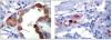 Figura 2. Hallazgos histopatológicos en biopsia renal de paciente con gammapatía monoclonal de significado renal (GMSR). A) Cadena liviana kappa en citoplasma de células tubulares. B) Cadena liviana kappa e inclusiones cristalinas.