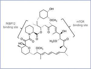 Between 1982 and 1988, rapamycin was developed as an immunosuppressive agent. Thanks to these studies, the mechanism of action of this molecule was clarified. Rapamycin interacts with the immunophilin FK506 binding protein (FKBP12) through its methoxy group. The rapamycin-FKBP12 complex is specifically bound to the mTOR protein, inhibiting the effector signalling pathways dependent on said protein.14 Rapamycin inhibits antigen-induced T cell proliferation and the cytokine-induced proliferative responses, including interleukin-16 (IL-16), immunoglobulin growth factor (IGF), etc. It follows the cytochrome CYP450 3A4 pathway as the main system responsible for drug biotransformation, generating inactive metabolites.