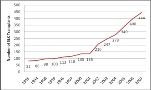 Según datos de UNOS (United Network for Organ Sharing, www.optn.org)2 y de SRTR (Registro Científico de Receptores de Trasplante que mantiene una base de datos de todos los candidatos para un trasplante de órgano sólido y de los pacientes trasplantados en Estados Unidos; los pacientes que reciben un órgano son seguidos de manera periódica con el uso de unas hojas de información completadas por cada programa de trasplante y remitidos a la OPTN [Organ Procurement and Transplantation Network]), el número de trasplantes combinados ha aumentado más de un 300 % desde la introducción del score MELD (Model for End-stage Liver Disease) como sistema para la distribución de órganos y así, mientras en el año 2001 hubo 228 candidatos y 134 receptores, en 2007 hubo 567 candidatos y 444 receptores, aunque la variación fue diferente entre las diferentes regiones de la OPTN (de 0 % a 43,7 % de incremento) (figuras 1 y 2), demostrando la falta de criterios uniformes en sus indicaciones.