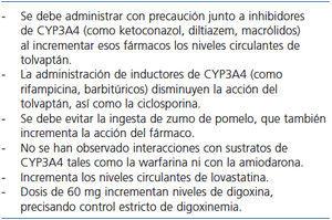 Tolvaptán: consideraciones generales. A la hora de usar tolvaptán, es importante considerar sus interacciones con otros fármacos (tabla 4). Al ser un sustrato para el citocromo P450 3A4, sus concentraciones aumentan en presencia de inhibidores y descienden al asociarse a inductores. Asimismo, dosis elevadas del fármaco (60 mg/día) pueden incrementar la concentración de digoxina en sangre.