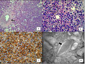 El examen patológico reveló un tumor encapsulado de 5,5 x 4,5 cm, de aspecto hemorrágico, con áreas fibrosas de color blanquecino. Microscópicamente la lesión tumoral se encontró constituida por células de mediano tamaño, con núcleos medianos, vesiculosos, con cromatina irregular, algunas con nucléolo inconspicuo y citoplasma eosinófilo, otras con citoplasma claro, dispuestas en un patrón difuso con extensa hemorragia y leve infiltrado inflamatorio mononuclear (figura 2 A y figura 2 B), sin invasión de la cápsula renal. No se encontró atipia celular, mitosis, ni necrosis. Las células tumorales fueron positivas para vimentina y mostraron una positividad fuerte y difusa para CD34 (figura 2 C). La observación a nivel ultraestructural permitió reconocer células con gránulos intracitoplasmáticos con diferentes grados de electrolucidez, rodeados por membranas. En cuanto a la morfología, variaron de redondos a alongados, adquiriendo algunas formas con bordes rectilíneos, y se destacó en algunos de ellos una forma romboidal cristaloide que a grandes magnificaciones presenta una estructura de zigzag de marcada electrodensidad (figura 2 D). Hallazgos vinculables a tumor de células yuxtaglomerulares (TCY), permitiendo corroborar la sospecha clínica.