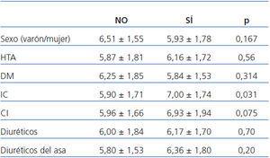 El AU presentaba una distribución normal. Los niveles medios de AU basal fueron 6,11 ± 1,7 mg/dl (rango 2,8-11) y su mediana fue de 5,85 mg/dl (P25 = 4,90 mg/dl, P75 = 7,07 mg/dl). Respecto al empleo de diuréticos: un 42,6% utilizaban diuréticos del asa, un 29,5% empleaban tiazidas, y los ahorradores de potasio eran los menos prescritos con una frecuencia de 11,5%. En la tabla 1 se muestra la asociación entre los niveles de AU y el género, los antecedentes cardiovasculares y el empleo de diuréticos. Los pacientes con antecedentes de IC tenían niveles de AU significativamente mayores (7,00 ± 1,74 vs. 5,90 ± 1,71 mg/dl, p = 0,031).