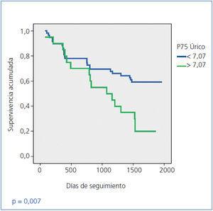 Figura 2. Curva de Kaplan-Meier de mortalidad según el P75 de ácido úrico