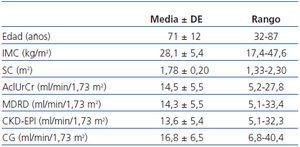 Tabla 1. Edad y parámetros antropométricos de los enfermos y resultado del filtrado glomerular con los diversos procedimientos