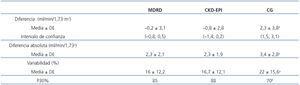 Tabla 2. Estudio de concordancia entre el filtrado glomerular y las ecuaciones de MDRD, CKD-EPI y CG